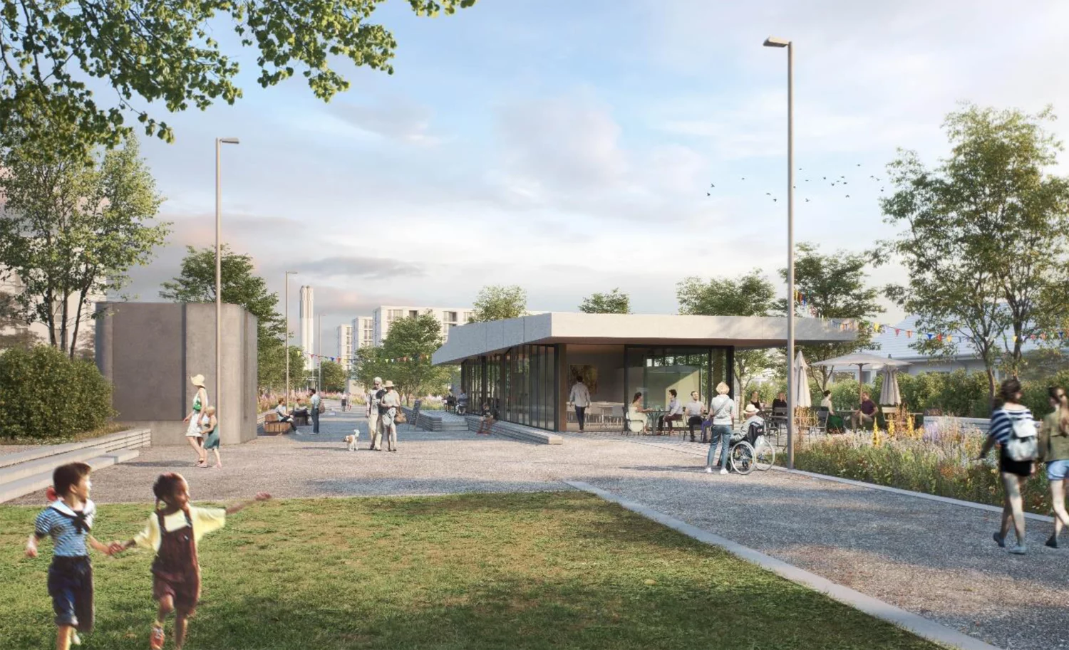 Das Erdgeschoss bildet dabei die kommunikative Schnittstelle zur Stadt: Arbeiten, Begegnen und Nahversorgung greifen ineinander und schaffen eine lebendige Adresse direkt an der Tramhaltestelle Überlandpark. Die Wohnungen in den Obergeschossen öffnen den Blick ins Grüne und bieten zusätzliche Arbeitsräume und Begegnungszonen.